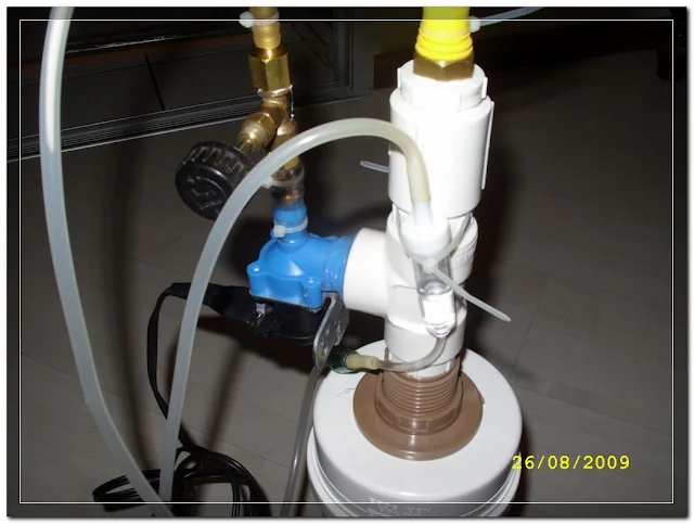 Aqui esta o conta bolhas feito com equipo de soro e logo abaixo dele esta a válvula anti-retorno. A válvula de ajuste fino (agulha) é uma utilizada em instalações de GLP (gás de cozinha) da marca jackwall com dois espigões, 1 de 1/8" e outro de 3/8". Para conectar a válvula agulha na solenóide eu utilizei um pedaço de mangueira 3/8" ligando a saída da solenóide na entrada da válvula agulha.